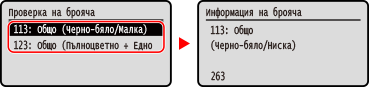 Можете да покажете брояч, показващ общия брой страници, отпечатани към момента черно-бяло и цветно.