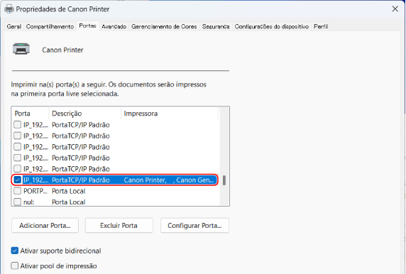 No separador [Portas], certifique-se de que a caixa de verificação [Ativar suporte bidirecional] está selecionada.
