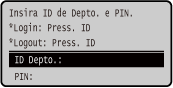 Quando a gestão de IDs de departamento está configurada, é apresentado o ecrã de início de sessão que se segue. Introduza o ID de departamento para iniciar sessão. Se o PIN estiver definido, introduza o PIN.