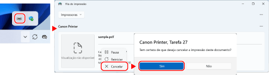 Se o ecrã acima não for apresentado, clique duas vezes no ícone da impressora na área de notificações do Windows, selecione o documento que pretende cancelar e clique com o botão direito do rato em