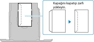 Zarfların yalnızca ön tarafına (zamk içermeyen taraf) yazdırılabilir. Zarf yüklerken, yönüne ve hangi tarafının yukarı baktığına dikkat edin.