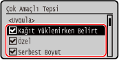Onay kutularının işareti kaldırılmış olan kağıt boyutları, kağıt ayarları ekranında görüntülenmez.