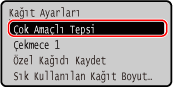 Çok amaçlı tepside daima aynı kağıdı kullanıyorsanız kağıt boyutunu ve türünü kaydedebilirsiniz. Bu, kağıt ayarları ekranının görüntülenmesini önleyerek sizi ayarları yapılandırma zahmetinden kurtarır.