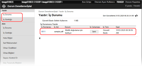 Yazdırılmakta veya beklemede olan işler için yazdırma verilerini silmek üzere [İş Çalışması] kısmında [İptal] öğesine tıklayın.