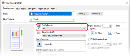 [Temel Ayarlar] sekmesindeki [Sayfa Boyutu] kısmında, belgenin kağıt boyutunu seçin.