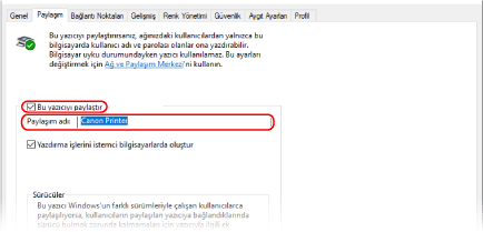 [Paylaşım] sekmesinde [Bu yazıcıyı paylaş] onay kutusunu işaretleyin ve bir paylaşım adı girin.
