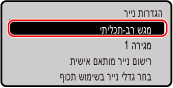 כברירת מחדל, כאשר נטען נייר במגש הרב-תכליתי, המסך להגדרת גודל וסוג הנייר מוצג בלוח הבקרה.