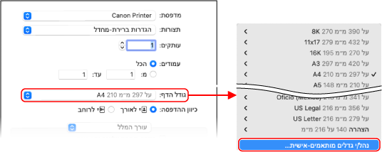ב-[גודל הדף] של אפשרויות ההדפסה, בחר [נהל/י גדלים מותאמים-אישית].