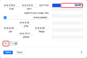 לחץ על [+] בפינה השמאלית התחתונה, לחץ פעמיים על [ללא שם], והזן את שם הנייר בגודל מותאם אישית.