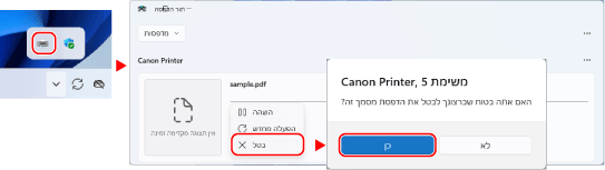 אם המסך שלמעלה אינו מוצג, לחצו פעמיים על סמל המדפסת באזור ההודעות של Windows, בחרו את המסמך לביטול ולחצו לחיצה ימנית על