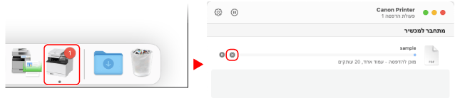 לחץ על סמל המדפסת ב-Dock, בחר את המסמך לביטול ולחץ על [