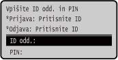 Če je nastavljen ID skrbnika, je prikazan zaslon za prijavo za postopke, za katere potrebujete skrbniške pravice. Za prijavo vnesite ID in kodo PIN skrbnika.