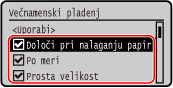 Na zaslonu z nastavitvami papirja so prikazane registrirane pogosto uporabljene velikosti papirja. Če so prikazane neuporabljene velikosti papirja, jih lahko skrijete za posamezne vire papirja, da lažje izberete velikost papirja.