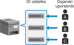 Uporabnikom in skupinam dodelite ID-je oddelkov glede na okolje in namen uporabe. Če nastavite kodo PIN za ID oddelka, lahko preprečite tudi nepooblaščeni dostop in omogočite strožje upravljanje.