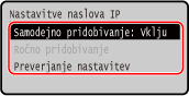 Nastavite na [DHCP]. Če pa je možnost [DHCP] nastavljena v okolju, kjer DHCP-ja ni mogoče uporabljati, naprava še naprej potrjuje funkcijo samodejnega pridobivanja v omrežju, s čimer je ustvarjena nepotrebna komunikacija. Če ne uporabljate DHCP-ja, nastavite to možnost na [Izključeno].