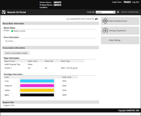 When you log in to Remote UI, the Portal page (Remote UI top page) appears. From here you can check the operations status of the machine, view various information, and change the settings with button operations.