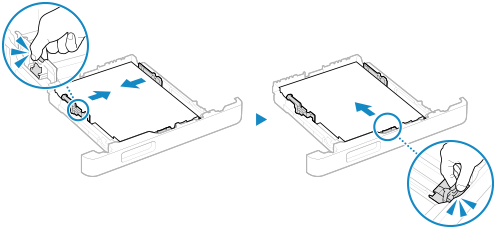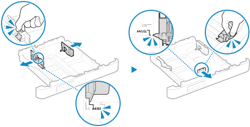 잠금 해제 레버를 누른 상태로 용지 가이드를 이동하여 돌출 부분을 해당하는 용지 크기 표시에 맞춰 정렬합니다.