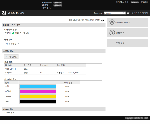 리모트 UI에 로그인하면 포털 페이지(리모트 UI 상위 페이지)가 나타납니다. 여기서 기기의 작동 상태를 확인하고, 다양한 정보를 보고, 단추 조작으로 설정을 변경할 수 있습니다.