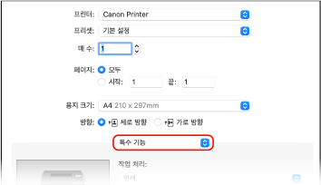 인쇄 옵션 팝업 메뉴에서 [특수 기능]을 선택합니다.