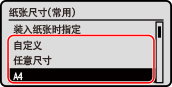 如果需要频繁更改装入的纸张,请设置为 [任意尺寸];这样可以减少每次更改设置时所需的步骤数量。但请注意,即使打印机驱动程序中的纸张类型设置与实际装入机器的纸张不符,此设置也会使机器执行打印。