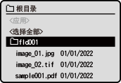 在 USB 存储设备中选择文件的屏幕将显示 USB 存储设备的文件和文件夹。