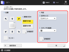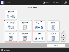 ページ番号や日付などの情報を付けてコピーします。「社外秘」などのスタンプを付けることもできます。スタンプには、任意の文字列を指定することもできます。