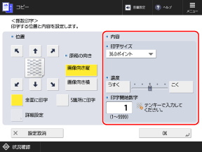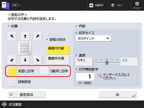 ※部数番号と併せて他の情報も付けるように設定されている場合は、[全面に印字]と[5箇所に印字]は選択できません。