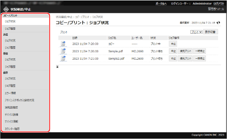 各機能の処理状況や使用履歴、本機の動作状況やエラー情報などを、リモートUIの[状況確認/中止]から確認します。