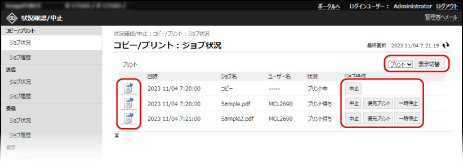 待機中のジョブを順番待ちの先頭にします。先に実行中のジョブの終了後に、[優先プリント]をクリックしたジョブが実行されます。