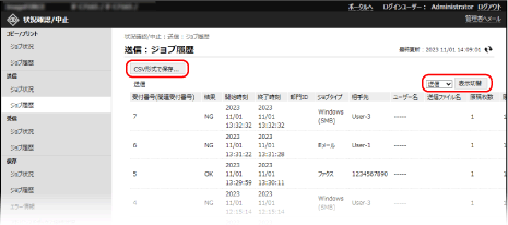 [CSV形式で保存]をクリックすると、表示されているジョブ履歴をCSV形式のファイルとしてパソコンに保存できます。