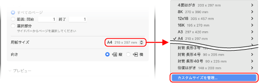 [用紙サイズ]で、[カスタムサイズを管理]を選択する