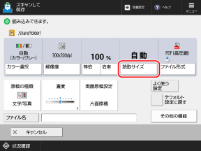 スキャンの画面で、原稿サイズの設定ボタンを押す