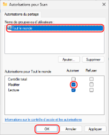 Pour [Autorisations], cochez la case [Autoriser] pour [Modifier].