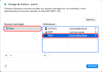 Pour [Dossiers partagés], sélectionnez le dossier créé.