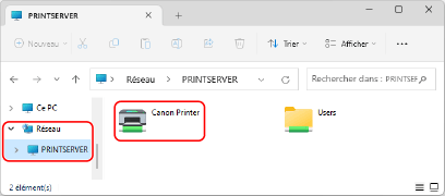 Dans [Réseau], sélectionnez le serveur d'impression pour afficher l'imprimante partagée.