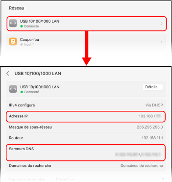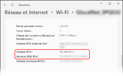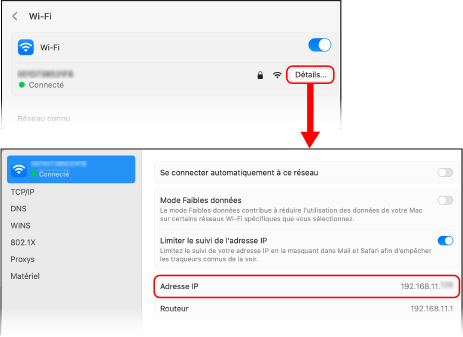 Cliquez sur [Détails], et vérifiez l'adresse IP dans l'écran qui s'affiche.