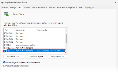 Dans l'onglet [Ports], vérifiez quel port est utilisé.