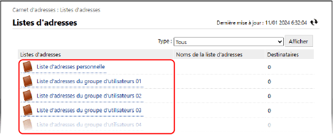 Page du portail de l’interface utilisateur distanteL'écran [Listes d'adresses] s'affiche.