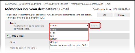 Dans [Type], sélectionnez [Mémoriser à partir du serveur LDAP], puis cliquez sur [Régler].