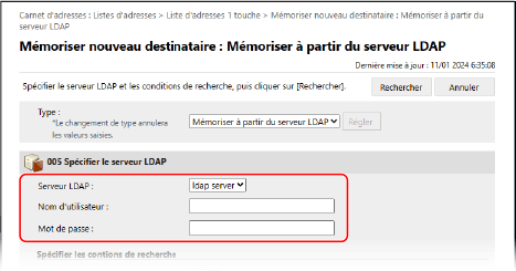 L'écran [Mémoriser nouveau destinataire : Mémoriser à partir du serveur LDAP] s'affiche.