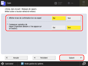 Réglez [Afficher écran de confirmation lors du rappel] et [Commencer opération de rappel] sur [Oui].
