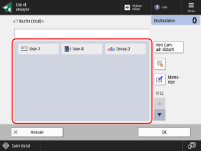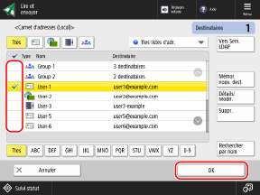 Lorsque vous utilisez l'écran de numérisation, sélectionnez les boutons des destinataires à spécifier, puis appuyez sur [OK].