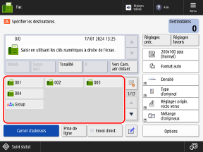 [Afficher fonction Fax]Dans l'écran de télécopie, seuls les boutons 1 touche pour les destinataires de type fax et groupe sont affichés.