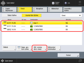 Vous pouvez spécifier des destinataires utilisés par le passé en appelant le journal des transmissions depuis l'écran [Suivi statut] du panneau de commande.