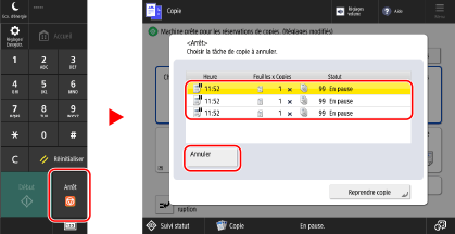 Arrêt], sélectionnez la tâche à annuler dans la liste des tâches de copie, puis appuyez sur [Annuler].