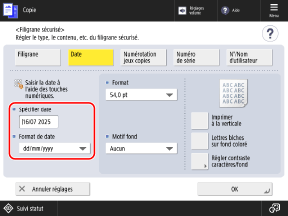 Les réglages configurés dans l'écran [Filigrane sécurisé] sont appliqués au format de caractère de l'échantillon d'impression.