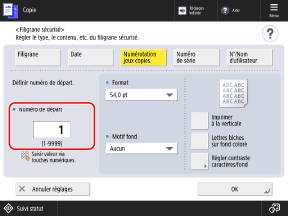 Vous pouvez incorporer des numéros de jeu de copies (pour indiquer l'ordre des jeux de copies). Ils peuvent être utilisés comme numéros de contrôle pour chaque jeu de copies.
