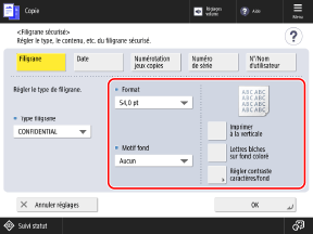 * Lorsque vous effectuez l'ajustement avec [Régler contraste caractères/fond] dans l'écran [Filigrane sécurisé], les éléments [Réglages d'impression] et [Initialiser] ne sont pas affichés.