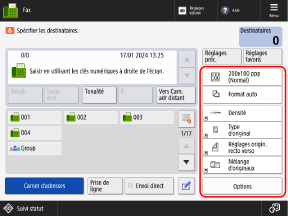 Lorsque vous saisissez le numéro de fax, vous pouvez utiliser des réglages tels que [Tonalité] et [Pause] en fonction du destinataire de l'envoi et du service que vous utilisez.