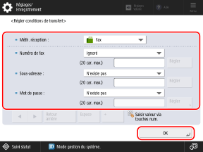 Spécifiez les conditions de transfert et de mémorisation, puis appuyez sur [OK].